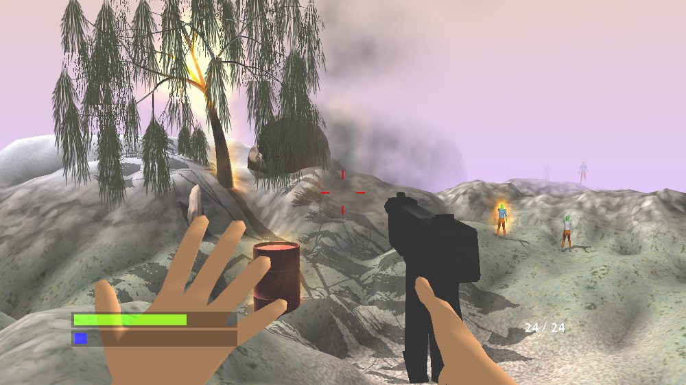 In Jimmy you run around and shoot aliens with a pistol. Later you get the ability to throw fireballs or upgrade your gun to an Uzi. Enemies start off only with the ability to run up and flail their arms at you. Later, they get armed with guns that seem to hit completely at random. There are also ones that explode when shot, which can be used to set up combinations. The aiming system works well and head shots do seem to matter. There’s a handful of missions that carry the playtime to around 90 minutes.