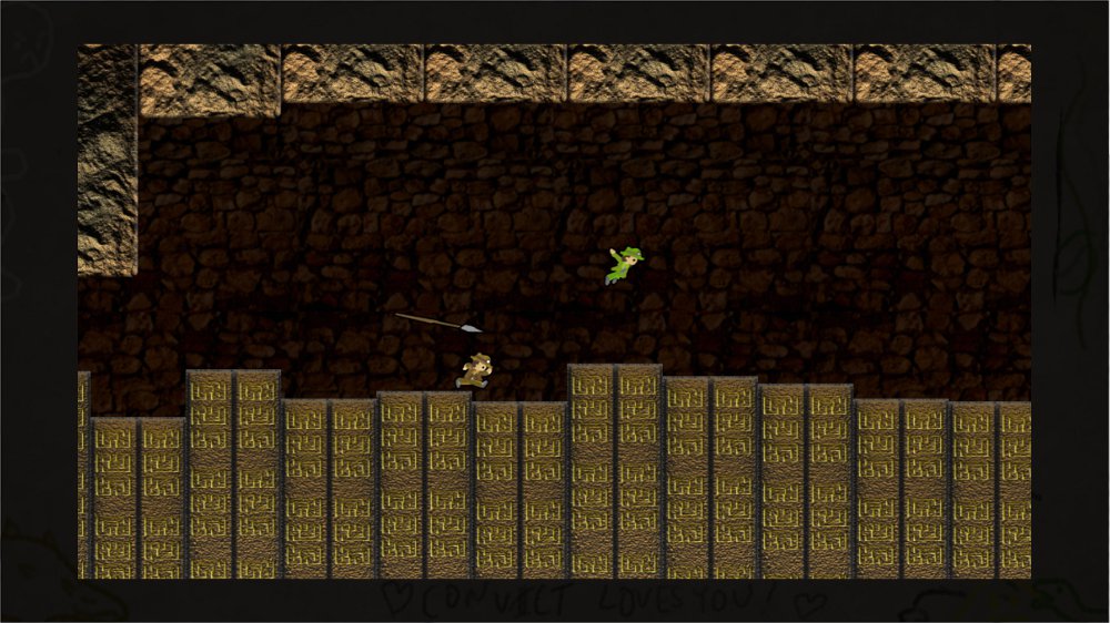 An auto-scrolling platformer where you have to jump from stone to stone, trying to avoid various pits and spikes. Of the five games, this one might have been the best if any effort was done to give it a purpose. You can play it with four players, which I suppose would make things interesting, but once you complete the run towards the gold-shitting monolith thingie, nothing happens. You can’t collect the gold or anything. Even better, there’s no “congratulations on making it!” screen. Instead, the ceiling collapses, killing you, which was the only way they could think of to bring you back to the title screen. This one actually controls the best of the five, but it’s still useless.