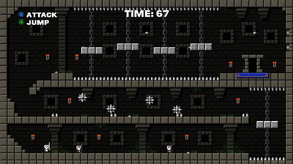 You play as this skeleton-knight-thingie that has to jump over spikes, avoid other spikes, hop across platforms, and occasionally fight baddies while making your way to the exit of a stage. The level design is reminiscent of the Platformance games as well, so you know what to expect. While in a stage, you have an infinite amount of lives at your disposal. If they just left it at that, I would be okay with the game. Instead, the developer Josep Monzonis decided to pull a king-sized dick move supreme by having every level run on an outrageous sixty-second timer. If the timer runs out, there’s no continues or level select option. You have to start the entire game over from the beginning.