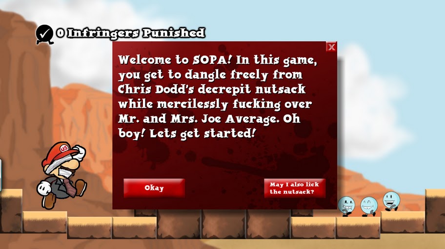 I normally try to keep my cards close to my chest when I write these reviews, but I can’t hold off any longer: I FUCKING LOVED THIS GAME! Think of all the dick moves you’ve ever pulled playing Grand Theft Auto and multiply them by a jillion. That’s how much fun you can have as an agent of SOPA. For example, I was perusing YouTube when I came across a video uploaded by a fourteen year old. It was a highlight reel of his best kills in Gears of War 3, set to the tune of “Let the Bodies Hit the Floor.” Now, if this was a game like Saints Row, you cap the little bastard in the back of the head and T-Bag his corpse. BOR-RING! In SOPA, you sue the little kid into the stone age, file charges against his parents, have their internet access cut off, and collect damages from YouTube because it was all their fault to begin with. With this level of loosely defined parameters, you have the freedom to pretty much destroy lives in ways you never could have imagined.