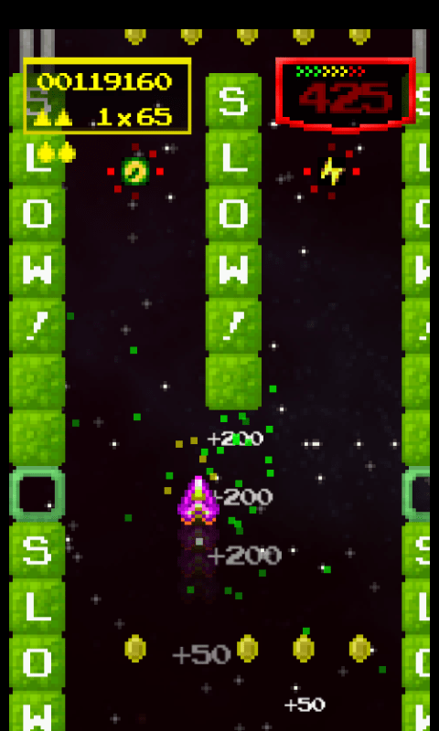 The idea is that you’re a ship with a hyperdrive set permanently in the “on” position.  With no way to brake, you have to clear gates and shoot any debris in your way, all while scrolling forward at break-neck speed.  There are some items that will slow you down, but for the most part you have to rely on quick reflexes and digital dexterity to survive.  You have a cannon but it fires automatically, so all you have  to worry about is using your finger to slide your ship back and forth.