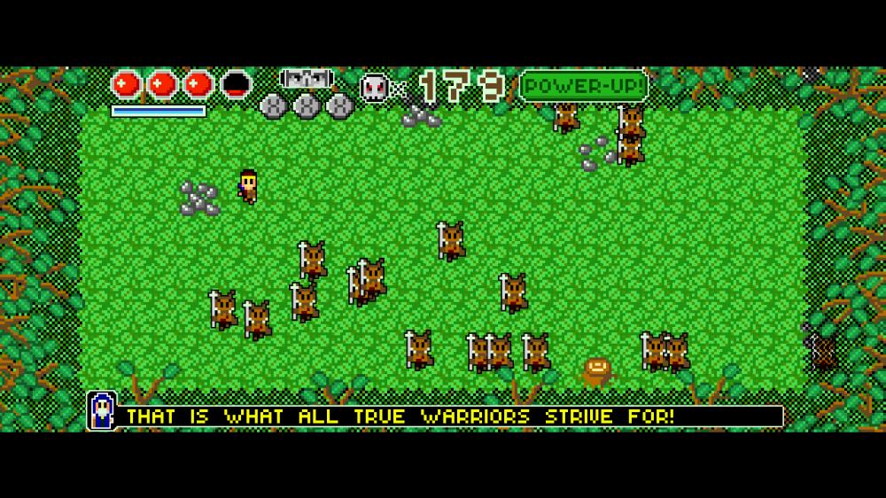 Retro Arcade Adventure is a single-screen hoard-slayer where you play as a dude with a sword who has to kill various evil thingies. All the baddies except the final boss take a single swing to kill and have no variations outside of size and speed. They’re all pretty much like the guys who run at you with the clubs in Smash TV. To fight, you swing with the A button, dash with the triggers (I never even knew this existed until after I had beaten the Adventure mode), and use a power-up with the X button that turns you into a gigantic black dude with a giant sword. Someone’s over compensating for something.