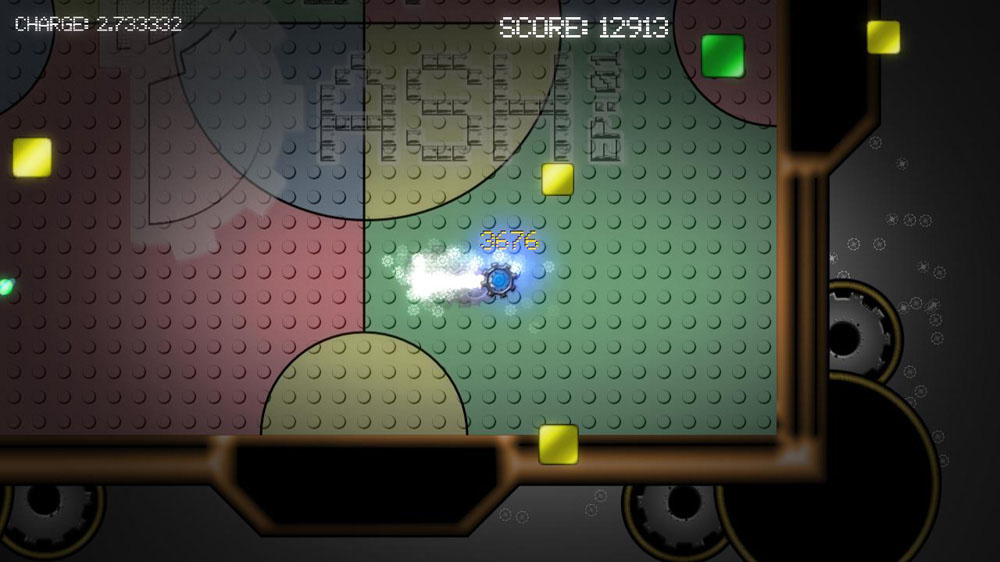 The idea is you’re a little wheel-thingie that has to avoid blocks that come at you from all sides. In Marathon mode, if you touch a colored orb, you gain the temporary ability to absorb blocks of that color, for points. Your goal is to score as many points as you can. This is the only color-matching mode, but it’s also probably the most fun. Time Extension is the second mode. Grabbing colored orbs is replaced with avoiding the blocks altogether and looking for orbs that extend the time you have remaining. Finally, there is Zone mode. Here, a scoring zone randomly teleports around the play field and you have to stay inside of it to rack up points.