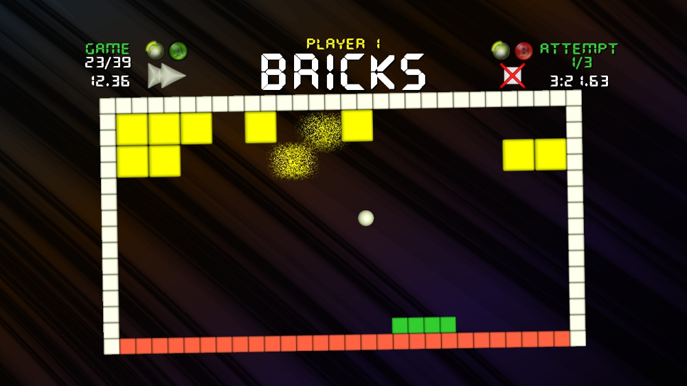 Alas, I had nothing to fear from Minigame Marathon. The concept is simple: take 26 small game types, string them together, and time how long it takes you to complete them all. And guess what? It’s fun and addictive! Many of the games are modeled after classics such as Pong, Frogger, Snake, or Breakout. Others involve simple tasks like staying inside a box, hoping across platforms, or collecting coins. The game uses an easy-to-decipher color system. You’re green. Anything yellow is good. Anything red is bad. It gives all games an immediate pick-up-and-play quality that is often not found in XBLIGs.