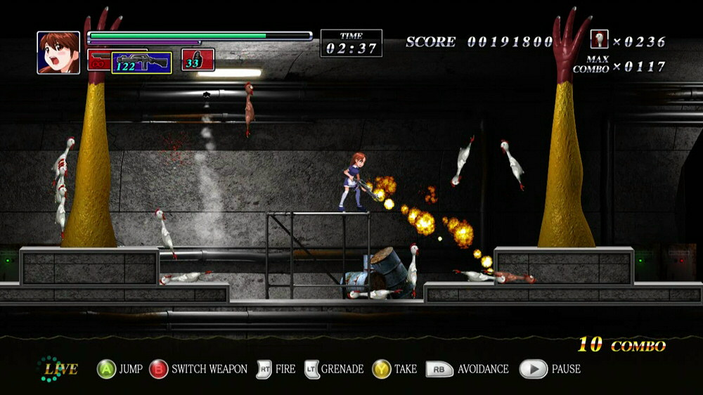 Theories can be a fickle thing. The chickens prove to be a little overwhelming. This is a war of attrition, where your only resource is patience and the chickens have numbers to spare. My “not a fair fight” theory was correct. I was just wrong about which side had the advantage. The chickens smother you in brutal numbers, sometimes on both sides, and you simply cannot avoid taking damage. Health fills are scarce, weapon pick-ups have very limited ammo, and grenades are sparse as well. You do get unlimited bullets with the shotty, but it’s not much help when enemies go from not being on-screen to causing you damage in a fraction of a second.