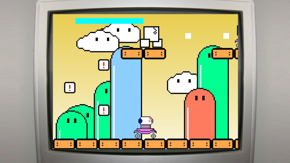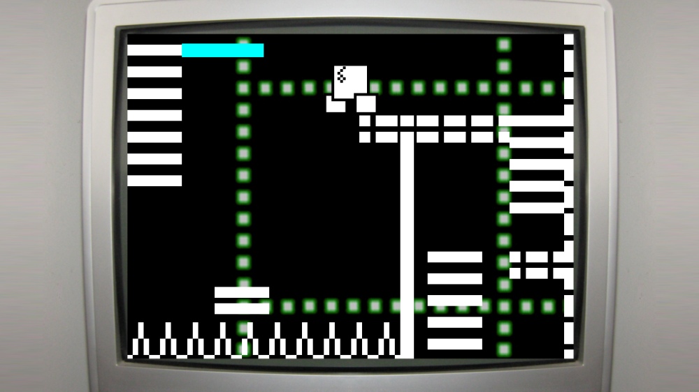 I only made it to the first branching path of the game.  Which is a nice way of saying that I beat the first level.  I then spent about an hour trying to get past either of the next stages, one of which is based on Atari graphics and the other Intellivision.  I really, really wanted to, because I wanted to see what would be next.  Again, the concept is fricken awesome.  But I couldn’t get past either of these stages.  There are too many enemies firing too many projectiles at you.  You have a health bar, but it fades quickly.  Enemy bullets move faster than you do, and you often don’t have enough space to avoid them, because if you jump over a bullet you’re probably going to come in direct contact with an enemy.  In the Atari stage, I was being bombarded on all sides by shots, plus a slow-moving dot that follows you around and is an instant-kill if it touches you.  The space you have to navigate this gauntlet is just a few character-lengths high.  If you stop moving, the dot will catch you.  Oh, and there’s also instant-kill landmines to jump over.  Does this sound fun to you?  It sounds like corporal punishment to me.