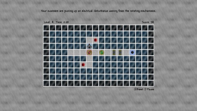 I’ll start with Dark Matter. Here, you’re a space ship that’s running out of fuel and oh my God you don’t really need a story for this, just shut up and get me to the puzzles. Dark Matter is an “open the exit” puzzler. You steer your ship around, hitting switches, pushing boxes, avoiding gaps in the floor, etc. Control at first seems a bit floaty, but you can quickly get used to it. Dark Matter also has a couple of puzzles where the control scheme gets reversed, with up going down and down going up, cats and dogs living together, mass hysteria. I’ll admit, it’s a bit gimmicky, but it does help to somewhat freshen up an otherwise dull game. And if that doesn’t work, a rage-inducing brain fart of game design by the jerks at Orbonis will.