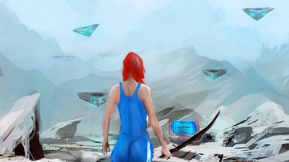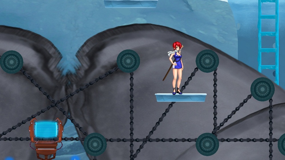 The idea behind Project Gert is it’s part platformer, part physics-puzzler.  Neither part is done particularly well.    The platforming sections are slippery.  As mentioned above, the game is set in an ice world, and I have to wonder if that was done to excuse the poor control in this game.  All movement is loose, to the point that you’ll inevitably slip off into pits and die.  The funny part is, enemies are affected by this too.  There were some machines on slopes that were slipping and sliding along with me.  Actually, it’s not so funny, since a few times this led to cheap deaths where they would slide directly into me.  And fighting back was sure an adventure unto itself.  Collision detection is spotty as hell, so you practically have to be on top of an enemy to cause any damage to it.  The line between where you can hit and enemy and where an enemy is hitting you is blurry, so I found just avoiding them seemed like the best strategy.  Again, maybe the ice setting is the reason, and the poor girl is frozen numb and can’t properly swing a sword.