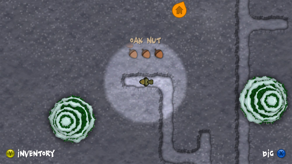 How about Toddlers Dig Deep?  Because this stripped down version of one of my former Top-10 XBLIGs is pretty much that.  Miner Dig Deep, sans strategy or most dangers.  Fewer upgrades.  Fewer things to mine.  The boulders are still there and can still cause you to scream curse words you forgot you knew, but that’s the only thing that can kill you.  There’s no need to worry about digging too many tunnels that could cave in, because the game is presented from a top-down view.  That’s the one advantage Squirrel has over Miner: you can mine in any direction.  Every other aspect is less than what is already offered in Miner Dig Deep.  There’s no positive outlook on that.  People who haven’t played Miner would be better served skipping this and playing that.  People who have played Miner can only find Squirrel to be an inferior, watered-down clone.  I kept waiting for the game to present some kind of hook to change things up, and finished it still waiting.  While I still was practically hypnotized by the prospect of digging up new materials, those moments are few and far between.  It even ends significantly faster than Miner Dig Deep.  Miner Dig Deep left me wanting more.  Procrastinating Squirrel left me disappointed, and recommending it would be nuts.