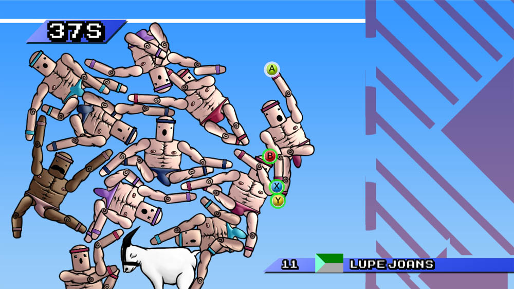Where Mount Your Friends really shines is in the multiplayer mode. Here, each player takes a turn trying to cross the bar at the highest point in the stack. Play continues until one player can’t make it to the top in the time limit. I’m shocked to say this, but this is one of the best multiplayer experiences to ever hit XBLIG. It even has online play that went off without a hitch. My biggest overall complaints relate to the movement physics. Flinging yourself instead of moving one hand at a time feels loose in terms of gravity and imprecise. I also had issues keeping limbs I didn’t want to use from going limp and getting stuck to one of the guys on the stack. I mean, wait, probably shouldn’t use the term limp in relation to this game. I mean they had trouble staying stiff. NO, erect. NO! God damn, this is tough to write about.