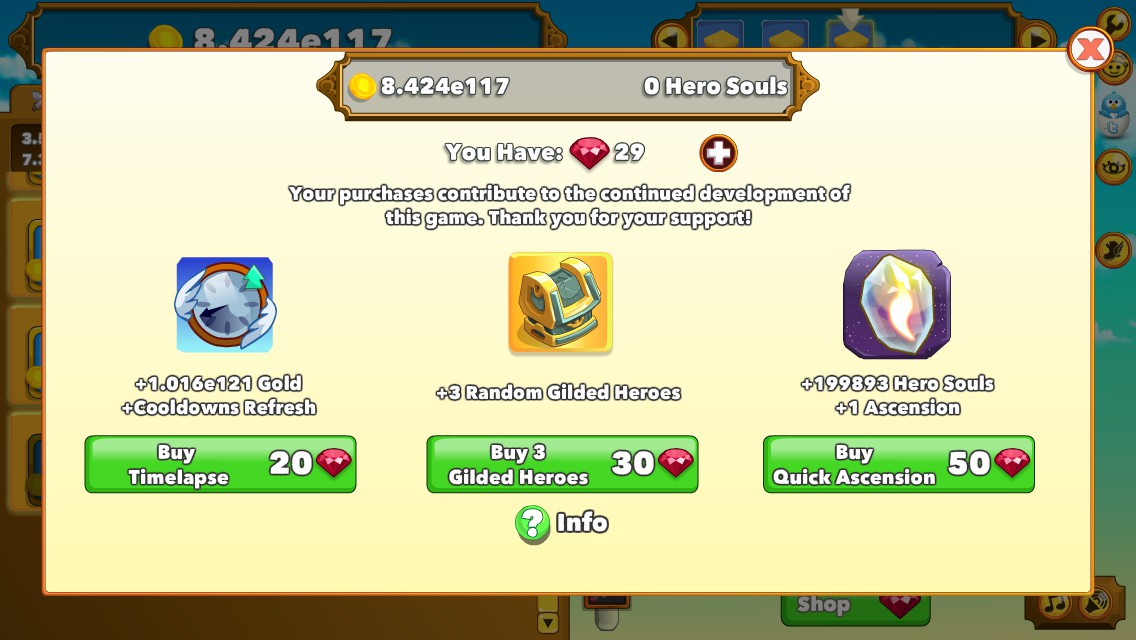 Here’s a thought for Clicker Heroes and any game going the freemium route: VIP subscriptions that give you substance. It can’t be something lame like “Get a bonus 10% damage if you’re a VIP member.” It has to be something that gives you value over what you could get by purchasing the gems in the game. Since freemium games struggle more and more to convert free players to paying ones, it boggles my mind that many never stop to reevaluate why. It’s an industry where achieving 5% conversion rate is considered a major success. Instead of shrugging shoulders and saying “this is the business we’ve chosen” why not say “5% sucks. Let’s figure out what we’re doing wrong.”