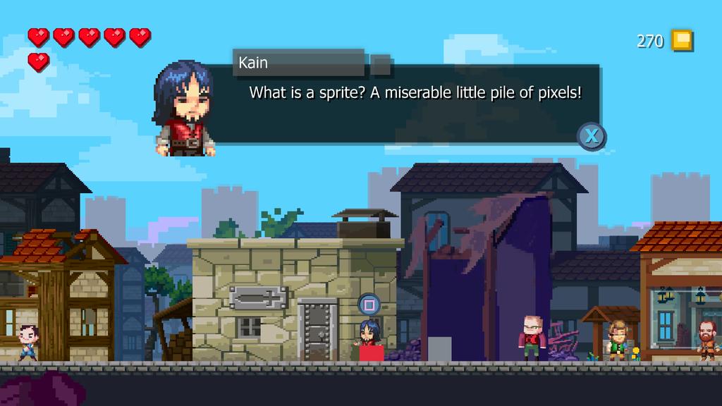 So the idea is you have a kingdom where the wealthy are fully developed 16-bit characters, the middle class are 8-bit characters, and the poor are single pixels. That whole point is mostly unexplored, though. Probably a good thing, since most games that try in earnest to tackle class-based subject matter do so with subtly on par with that delivered by the Enola Gay. Really, the plot is evil queen kidnaps princess. To Pip’s credit, the writing is sharp and almost immediately laugh-out-loud funny. In fact, it’s so good that I feel the developers sort of blew it in a different way. It’s one of the few traditional platformers where I actually gave half-a-squirt about where they were going with the story direction, but the setting itself never receives enough consideration or a satisfying payoff. It’s not fair to do that. Imagine if other stories were told like Pip’s is.