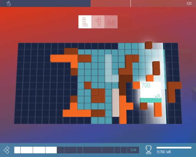 If you’re not familiar with the concept, the formula is basically Tetris + Luminies – tension = Chime. You get a grid to place various shapes of blocks on that you have to arrange in 3×3 or larger “quads”. When a quad is formed, a meter starts to fill up inside it. You can keep adding blocks around it to make it bigger. Once the meter is all filled up, the size is locked in and the blocks are deleted the next time the pace ticker scrolls by. It aims to be a kinder, gentler action-puzzler that’s more relaxing than its sweaty-palms forefathers. And it succeeds. Mostly.