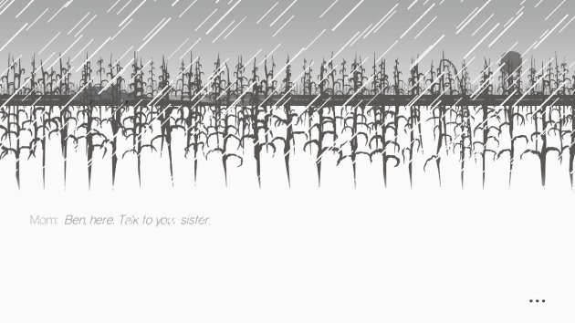 A text-based game has to have sharp writing and something intriguing about it to make the experience worth your while. The point-of-view character is Kelly, a mid-20-something who just moved back home after some sort of falling out with her boyfriend. Her Mom is an overbearing bitch. Her Dad is an off-his-nut alcoholic who apparently had a leg amputated following some sort of farming accident. Her brother is a self-indulgent twat who writes sloggy fan-fiction (clearly this was the author insertion character). Unfortunately, the game is framed as being a casual phone call with your family. The one and only positive thing I can say about Three Fourths Home (I refuse to enable to their bad grammar by not capitalizing the title) is that the dialog often does feel like real inane banter between a daughter and her cunt mother, stumblefuck father, and douchebag brother. But, that’s kind of the problem: they’re fucking boring. The stuff that IS interesting, like why Kelly moved back home and what caused her family to leave the farm she was visiting for old time’s sake, is kept somewhere in the background. Instead, topics center around a swear jar and your brother reading his shitty short story to you (how meta). There’s a ton of filler that doesn’t seem to go anywhere. You don’t really get any closure on the family situation because, as you make your way home from a drive out in the boonies, a tornado warning hits. There’s also an epilogue that feels more like a prologue, but it doesn’t really help either.