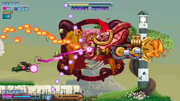 But Q-Yo adds strategic elements like the ability to collect “pulses.” Activating them turns all the enemy bullets on-screen into collectable energy that you can use to charge your own super weapon. It’s a fun concept that doubles as both a planned attack and an emergency get-out-of-dodge button. Plus, while you can select between using a mega laser or a shield as your super weapon on the character select screen, using the mega laser also will clear any bullets directly in the line of the blast, effectively making it a shield. You’ll need this for certain boss fights, especially on the normal difficulty. You get upgrades between each stage, but I wish those upgrades allowed things like increasing the amount of pulses you can collect. The upgrades all work, but they don’t make you feel like you’re gaining significant power. They’re small edges that you might not even notice are happening, like increasing your own bullet speed. With some characters that increase is so slight that it practically makes no difference. Also, you can choose to get a 1up between each stage, but you get a ton of continues on both easy and normal, so really the 1up is every bit as stupid a choice as taking the potion over an extra heart container from the old lady in the original Legend of Zelda.