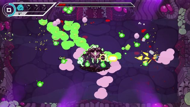 This is only the second of four worlds. There’s enemies that can unleash long-lingering screen-blockage. In a game based on fast-moving, swarming enemies. Oh, and there’s mines on the ground, usually three per room. And it gets even worse. See that green puddle peeking out? Yea, those can be entirely covered by the clouds and cause damage if you step on them. There can also be pink puddles that glue you to the floor. There’s a dash mechanic that you can upgrade that somewhat shields you, but if you don’t shoot down the cloud things (which are the fastest moving enemies I’ve encountered), you have to deal with that much obstruction. This is absolutely unreasonable and beyond ridiculous.