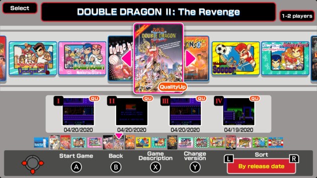 Double Dragon & Kunio-Kun’s menu has multiple filters AND each game gives you four save-state slots instead of just a single one that you get per game for Capcom. Also, look for the “Quality Up” tag in the corner of each game’s cover, like seen here. If the game has it, that means most of the flicker and slowdown inherit to NES/Famicom hardware has been removed. BUT, if you insist on having the crappy flicker and slowdown, you can switch to that version of the game. This is a hell of a package.