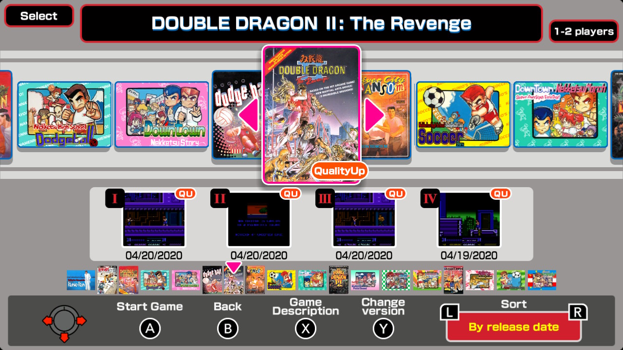 Double Dragon & Kunio-Kun’s menu has multiple filters AND each game gives you four save-state slots instead of just a single one that you get per game for Capcom. Also, look for the “Quality Up” tag in the corner of each game’s over, like seen here. If the game has it, that means most of the flicker and slowdown inherit to NES/Famicom hardware has been removed. BUT, if you insist on having the crappy flicker and slowdown, you can switch to that version of the game. This is a hell of a package.