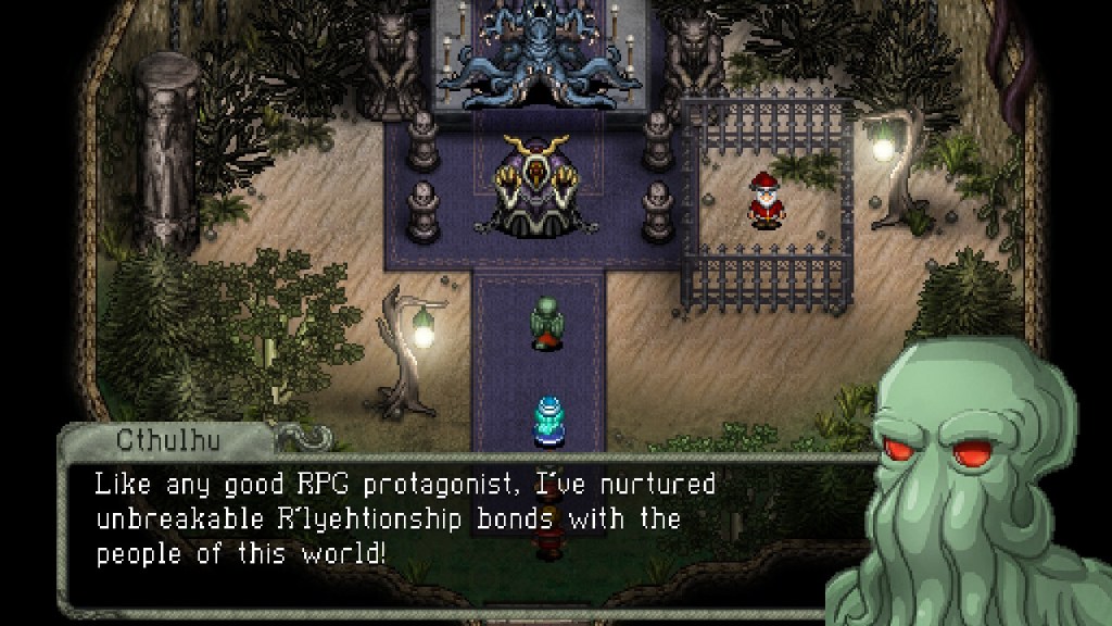 To CSC’s credit, it never gets boring, and writing is always absurd enough to hold your attention. Yet, I can’t help but get the distinct feeling that Zeboyd couldn’t believe they were still making games like this after a decade. Their magnum opus, Cosmic Star Heroine, did well enough but wasn’t exactly a world beater as far as RPGs go. Cthulhu Saves Christmas has the feel of a game that says “couldn’t you pricks have saved us from making games like this?” Or maybe I’m reading it wrong. Maybe they’re every bit as nostalgic for a simpler time as I am. I usually disclose friendships earlier in reviews, but I guess now’s the time to note that I love Robert & Bill Zeboyd. They’re my friends, but more than that, they were partners in that weird and often frustrating world of Xbox Live Indie Games. We were on different sides of the table: they were makers of XBLIGs, while I was a critic XBLIGs. But we all struggled to get attention for the community together. They certainly made my job easier, to the point that I actually felt sorry for them. They seemed too good to be stuck hocking their games for 240MSP to 400MSP (MSP is Microsoft Points. 80 Points = $1). When they were chosen to become Penny Arcade 3 and 4’s developer, but with their games still stuck on XBLIG, part of me smiled, but most of me felt heartbroken for them. “Jeez, really? Even with the license, they’re going to be stuck on the same sales page as vibrator apps?”