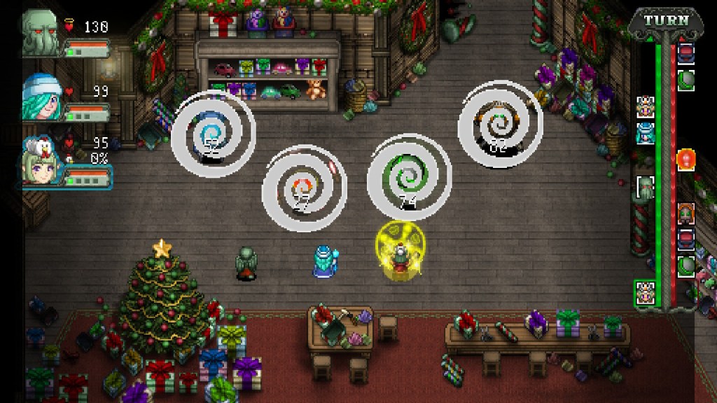 If you’re looking for “hardcore” RPG experience, something tells me you’d know enough from the title to realize you’re not getting it here. Or, if you’re familiar with Zeboyd’s work for that matter. Not that they can’t do damn fine RPG mechanics. Honesty, their Penny Arcade titles probably outclassed anything the Xbox 360 ever offered. But, even with really fun combat mechanics, you’re never going to be immersed in this world. In fact, the humor landing requires you to be as detached from the goings-on as humanly possible. That’s sort of the point. And yea, it’s really fun to play Cthulhu Saves Christmas. The set-up of having some attack options being chosen at random, while others you can organize and optimize for making battles be breezy is quite satisfying to build and implement. Besides, it moves at such a blistering pace that you never even have time to be bored. Things like exploring towns are shit-canned in favor of having to choose a handful of events between each stage which will give you a pre-set reward. It does feel rushed at times, but there’s always a disarming joke to go along with the feeling, as if the devs are letting you know “game makers get bored too, you know?”