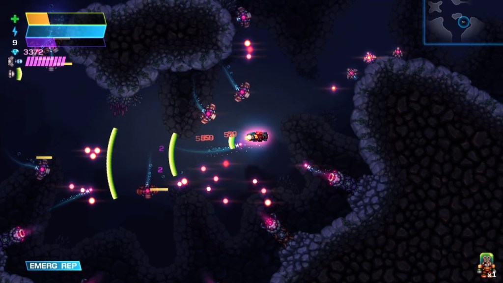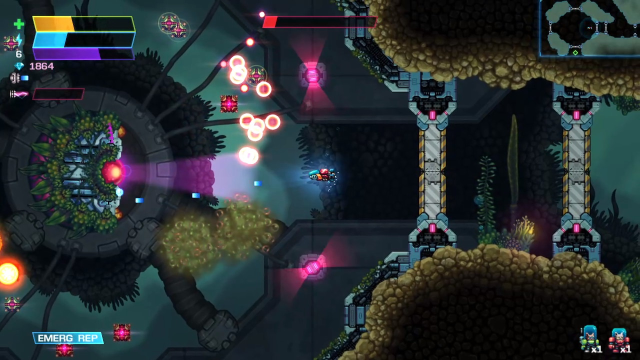 Astro has a relatively simple XP system, but that system combines with a large amount of weapons, items, and variables to create one of the deepest and most rewarding loadout systems I’ve played as IGC. It’s staggering how much variety there is, and how gosh-darn fun it is to experiment and find uses for the various weapons. Two guns can be equipped at once, but they consume various degrees of energy or bullets. The guns themselves have levels and different attributes. You might have, for example, two versions of the basic pea shooter that are both a level 8. But, one might provide a boost in your shield, while the other provides boosts for energy consumption and regeneration. Guns can’t be leveled up. Instead, you purchase them from save stations or, more rarely, collect them from fallen enemies or chests. This applies to passive items too, which might make torpedoes turn sharper, increase chances of critical hits, or add value to the gems you need to buy more weapons and upgrades.