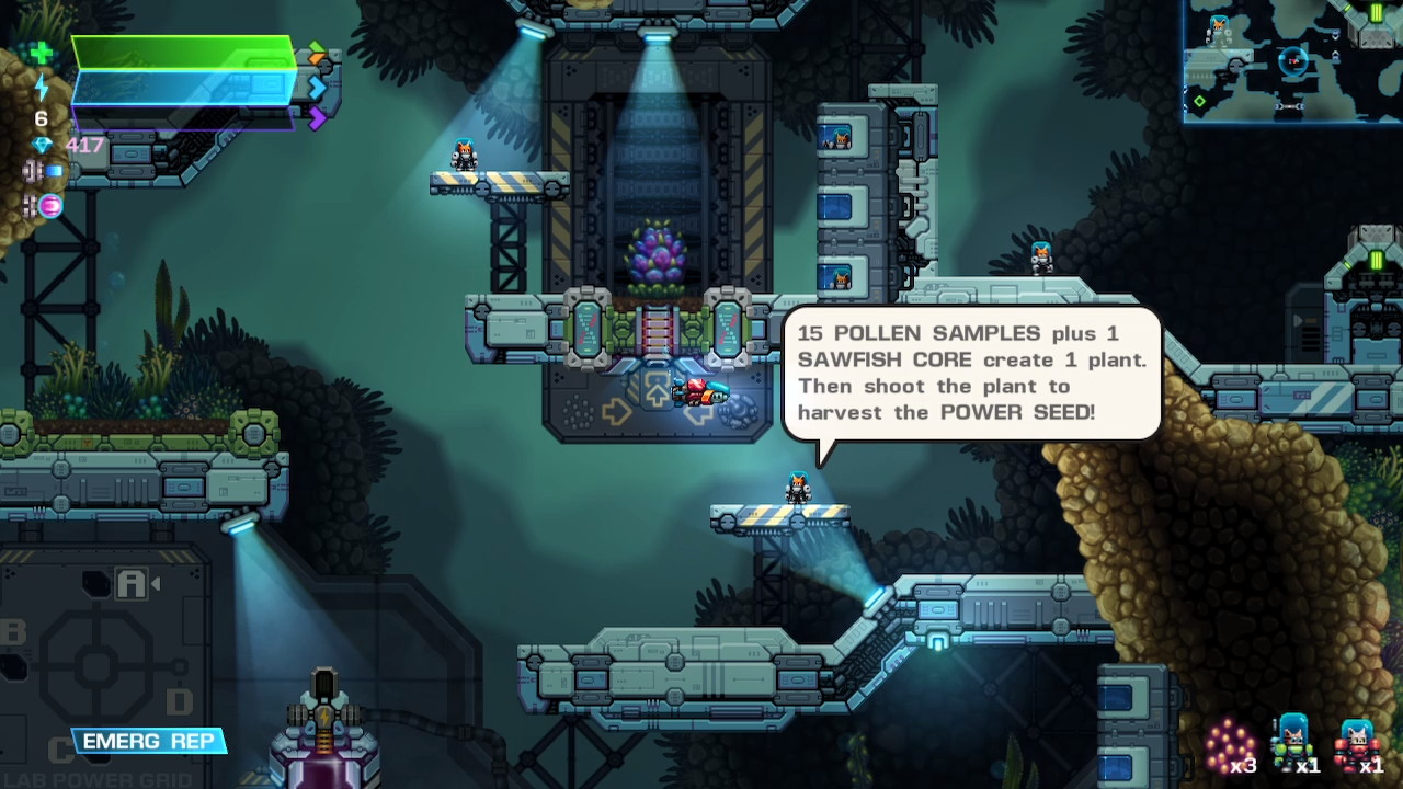 Astro Aqua Kitty kind of feels like a Metroidvania, but it’s not. It’s broken up into absolutely MASSIVE stages that present a variety of objectives for you. Most of these come down to “retrieve person and/or object and deliver to spot on map” type of shenanigans. Along the way, you’ll face swarms of enemies, often so many that the screen temporarily fills up with enough projectiles to make it feel like you’ve slipped into a bullet hell. The pacing can be stop-and-go, as enemies don’t FULLY respawn once you’ve cleared out part of the map. An indicator you’re on the right track is usually running into another big action beat. The lack of respawning is probably to prevent grinding. Yes, grinding. I should mention that there’s RPG mechanics in this. See, I told you it’s hard to pinpoint exactly what Astro Aqua Kitty is.