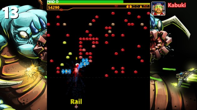 Hey look! There’s even shmup-type character selection, so players can tailor the game to their own play style! I preferred Kabuki, even though my high score was with Champ. There’s online leaderboards, but the boards don’t say which character the best players use. I’m kind of curious about that stuff.