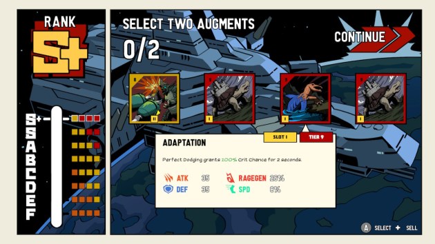 That’s because Dawn incentivizes combos above all else, and if you lose the combo between the first enemy in a batch and the last one, at least in the latest stage you’ve unlocked, you’ll almost certainly get a less than perfect score. Not always, but often enough that, if you’re playing a stage in dire need up upgrades, you might as well reset and start over if you score anything less than an S rating on any batch of enemies. Scoring all S ratings and never losing a life on a stage earns you an S+ rating for the entire level. When you earn an S+ on a level, of the four random upgrades you’ll get to choose from, three will be from the highest level up to that point, with a final one being a level below that. Also, once you’ve earned an S+ on a stage, you can replay the stage as poorly as possible. It won’t matter, because the upgrades will be the same: three from the top tier, and one from a tier below that.