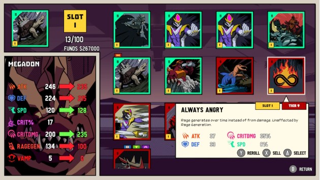 The big hook for Dawn of the Monsters is, upon completing every level, you’re giving a random choice of upgrades to select from based on how well you did. There’s three different types of upgrades (literally types I, II, and III) that give you special benefits PLUS boosts in offense, defense, and two boosts in two other random attributes. Once you’ve selected a boost, you can pay extra to re-roll the four stat-upgrades until you get a stat sheet you find suitable, and any old boosts can be sold for money. It’s a hook both makes the game more addictive and also causes the majority of issues it has. Levels consist of a series of “arenas” where enemies spawn until the game assigns you a score for that particular batch of enemies. Once the first enemy of each batch is defeated, you really need to keep the hits coming.