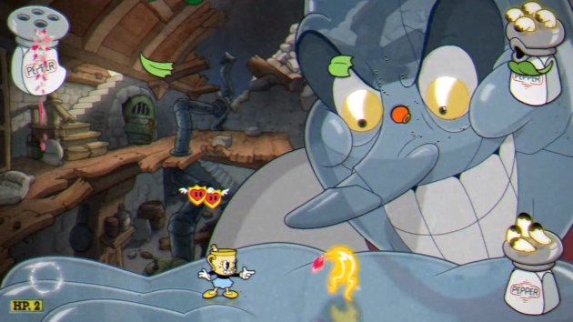 PHASE TWO – SALTED NUKES: Yea, this is the most visually awesome sequence in the entire game. It’s so awesome. Here, you shoot four pepper shakers that crash into Chef Saltbaker and progressively crack him. The pepper shakers shoot projectiles, some of which can be parried, and leafs rain down from the ceiling from time to time. The fire from the previous stage is back as well. I highly recommend the crackshot for this battle. When you’ve done enough damage, you’ve earned a break with one of the easiest and quickest phases in any boss fight.