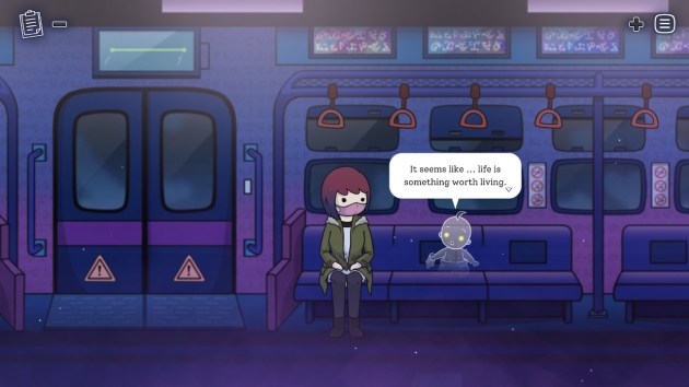 In What Comes After, a girl named Vivi, who is having thoughts of ending her life, falls asleep on a subway. When she wakes up, she finds the train is populated by the ghosts of everyone who recently died within 10km of the train station. This apparently includes a giraffe and an elephant. I’d like to think this is setting up some kind of bad ass Mortal Kombat-like prequel showing how that happened on the same day. Anyway, there’s no “game” here. You just talk to the ghosts, and they wax philosophically on the meaning of life. Some are okay with being dead because they’ve lived full lives and felt complete. Many have regrets. They all feel happy for the girl that she’s still “so full of life.” Sigh.