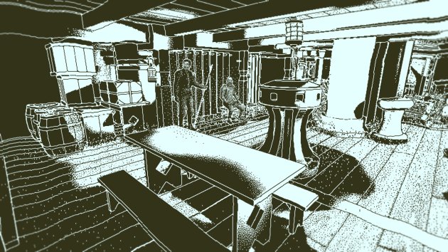 Obra Dinn leans heavily on nonlinear storytelling. The game opens with the ultimate final fate of the final handful of surviving crew. To its credit, it’s immediately jarring, as you see the captain blow some poor SOB away, which is no doubt the cap to a mutiny. The problem is, Obra Dinn uses the jump-around too much, and not always in service to keeping the player engaged. There’s a moment where most players are like “okay, wait, this isn’t just a ship where a series of random calamities happened” where you see the crew fighting a giant mutant crab monster that looks like something out of John Carpenter’s The Thing. It’s genuinely jaw-dropping, even if my Dad and I both started giggling at how silly the plot was starting to become. By this point in the game, you’d already seen the crew fight a giant squid, but that’s a fairly common nautical trope. Creepy ass giant crab-spider things being rode by spooky, shapeless riders? Not so much.
