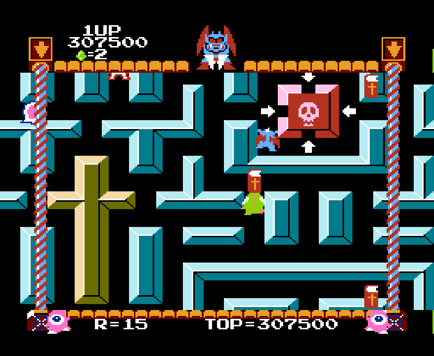 Admittedly, sometimes Devil World can be pretty frustrating. The devil shifts the scrolling at random, and sometimes the screen becomes oriented in a way where you literally can’t do anything except wait for the Devil to pick another direction. Here, I can’t get the final bible into the slot because I physically can’t fit into the gap. What you’re not seeing is the Devil kept scrolling up and down, but not side to side. I had to wait quite a while for the tide to turn even after I shot this screen cap.