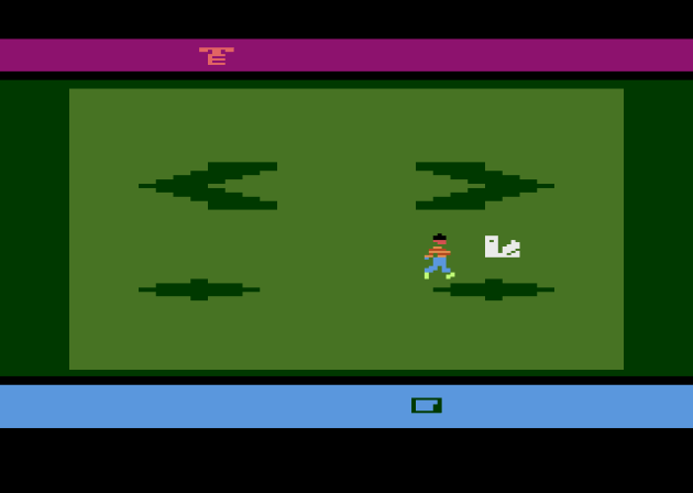 And it’s not even complicated boring. The object is to locate three pieces of your phone and then, well, phone home. To find the phone pieces, you have to deliberately fall into the various pits in the game, then stretch your neck and hover out. Most of the pits are empty, and whether they are or not, it’s a slow climb out. Of course, you’ll just as often fall into pits accidentally, since they’re all over. It’s such an obviously doomed-for-failure play mechanic to begin with, and that’s before you get to having the threat of falling right back into the hole hanging over you. Hoo boy. Yea, it’s not so much the falling in pits that wrecks ET. It’s sheer volume of them (too many) AND how easy it is to fall back into ones you just climbed out of (too easy). Now, I also did play several rounds of E.T. without rewinding or save states, and that’s where I realized it was the falling back into the pits that really destroys the game. This could have been fixed by having you not be able to fall back into the same pit you were just in without leaving the screen first. Or hell, just have each pit fill-up once you hover out of them, permanently. That doesn’t fix everything but it would sure take the edge off. Which is like saying the benefit to losing a leg in a traffic accident is that doctors won’t be stingy with the percocets.