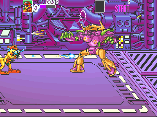 Oddly enough, baddies aren’t as spongy as you would think. The one thing I can give Bucky credit for is the game skips along at a surprisingly blistering speed. Enemies might take as little as one shot to finish, and bosses don’t just suck up bullets either. I wasn’t expecting that. There’s also a much wider variety of moves than I figured. Like a brawler, you can jump and do jump kicks.. sometimes. I couldn’t consistently pull this off. But, I could do the “special attack” every single time with minimal issue. It’s done just like TMNT and other brawlers where you hit the jump and attack buttons at the same time. There’s no penalty for it and you can spam it as much as you want. Maybe that wasn’t so wise, as I kept doing this over and over. Bucky does very little to encourage you to play with finesse.