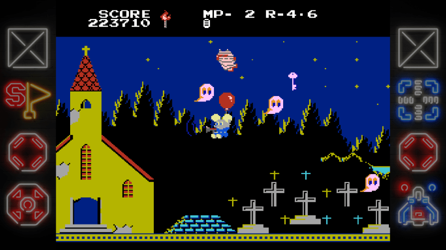 Level 6 in each cycle plays different from other stages as well. In it, you grab a balloon and float around the stage. Unlike other stages, you have a gun with unlimited firing capability that you can use to destroy the ghosts that chase you. It’s Mappy Land’s version of the swimming stages in Super Mario: a short, quick distraction from the main style of game, but enjoyable enough. Of course, when you enter the buildings, the gameplay reverts back to the same trampoline-based shenanigans.