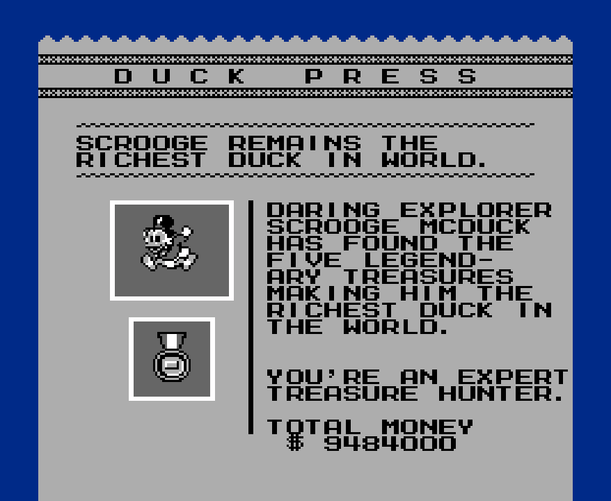 I blew the “hidden ending” by not knowing about it until I was halfway through the game. If you finish with $10,000,000, the headline at the end changes. By time I found out, I had already beaten two stages. I hadn’t fully explored the Amazon or Transylvania, and it was too late. Don’t worry about the timer and just get all the money THEN take Launchpad back and start each level over again.