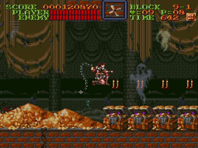 It speaks to how dazzling the tour through Dracula’s crib is that Super Castlevania IV isn’t boring. Canonically, it’s a pseudo-remake of the original game, but it feels more like a re-imagining where everything has been scaled-up. Simon’s sprite is bigger. Enemies are bigger. The levels are bigger. The bosses are bigger. The world is much more alive. There’s entire new set-pieces and boss concepts too. Given how much easier the game is, it almost feels like a guided tour through a haunted house attraction, complete with dancing ghosts that you have to battle against. There’s a spooky library with paintings that follow you. There’s a creepy dungeon with pools of blood (well, it’s blood in the Japanese version). One stage even takes place in Dracula’s vault, and to complete the immersion, you collect TONS of treasure bags in it.