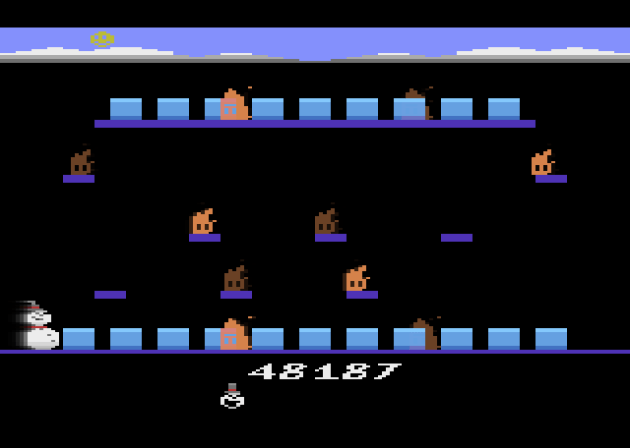 The gap issue is my only major complaint, and it’s not even THAT major. It’s a medium-sized complaint. A whine, really. Otherwise, Stay Frosty is really good, and not just for what the Atari is capable of doing. I mean this is a clever game that actually offers satisfying platforming shenanigans while also featuring some deceptively deep puzzle design. You don’t have to actually grab every sheet of ice. The focus is only the fireballs. You have to plan for the rate of melt and how many ice sheets you should hop over to save for later, and how much they’ll be melted by time you need them, and how much body you’ll need left to defeat each fireball. And while you’re doing all that, you actually have to hit your jumps. And it’s FUN and it’s fresh. In a just world, this would be a holiday classic you pull out during the Christmas season between watching Rudolph the Red Nosed Reindeer and the Frosty cartoon. It’s wonderful. There’s even a sequel that adds a lot more nuance. But hey, I have to save that for next year when I’m crunching for content right before my big Christmas special feature.