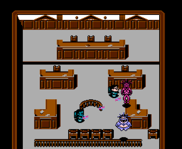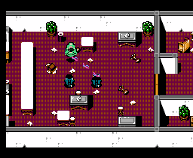 And.. that’s the whole game. There’s no items (except an occasional points bag that seems to happen in random rooms). There’s no upgrades. You have unlimited proton pack energy and unlimited traps. Despite adding tons of scenery that’s begging to be searched, like filing cabinets, chairs, etc, you don’t search for anything. Just zap, trap, and move on through five levels, four of which have bosses, then you fight Vigo and that’s the game. When you first fire-up New Ghostbusters II, it really does feel like you’ve found buried treasure. It is satisfying to catch a ghost in your beam and then suck it into the trap. But, that wears out very quickly. There’s nothing to break up the tedium. It’s not even a maze game, really. Even if the room has multiple doors, a gigantic arrow appears in the center of the screen and points you to the next room after you bust the current room’s final ghost. While there’s a nice variety of ghosts, some of which throw projectiles, the offensive game of New Ghostbusters II is just too limited. As far as action games go, New Ghostbusters II is one of the most tedious, mind-numbing grinds in the entire NES/Famicom library. It gets so boring doing the same thing over and over, in stages that feel like they’re taking forever.