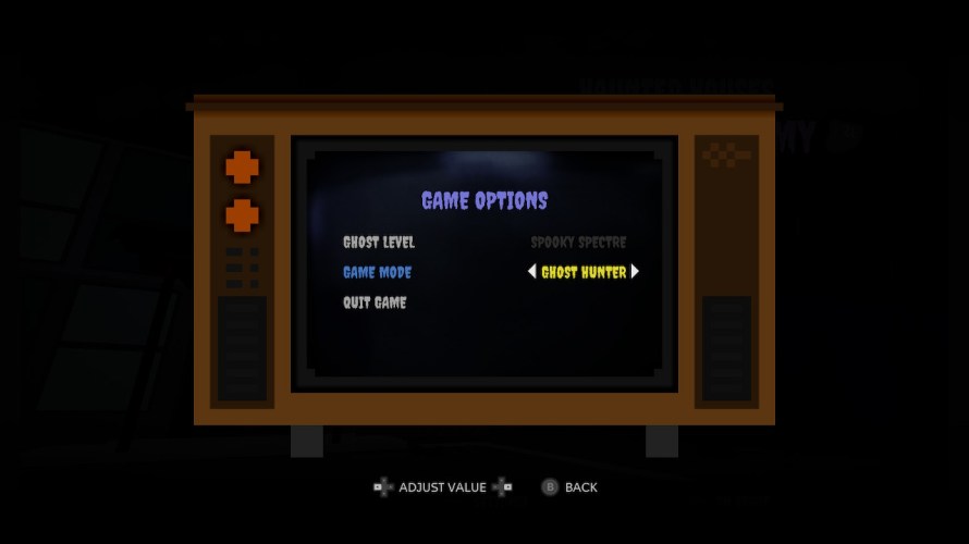 You apparently have two difficulty options. Spooky Spectre and Dark Spirit, and two gameplay modes: Ghost Hunter and Ghost Rush. What do these do? You have to figure that out on your own. There’s no explanation. I’m so sick of games that do this type thing. How hard would it have been to just say “difficulty” and “timer?” It’s the options menu, not a single’s bar, so save the awkward fake charm. Nobody goes to an options menu wanting or expecting to have to figure out shit on their own. It’s not cute. It’s not clever. It’s just obnoxious in the same way sarcastic people are. There’s a time and a place, and the options menu isn’t it.