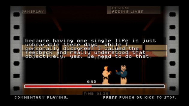 Speaking of the audio commentary, it’s not something you can detach from the game itself, like you could with the commentary for the Apple II version with Jordan & Francis Mechner. This commentary is context sensitive, sort of like the kind found in Portal. I loved the commentary track. Like the best filmmaking tracks for movies, it features a passionate creator mixing the right blend of personal history, technical explanations given in layman’s terms, anecdotes, and oddball factoids. I actually did learn things I didn’t know even after I finished the entire Making of Karateka presentation and walked away with a greater appreciation of what Jordan Mechner accomplished with it. But, the track does create its own set of problems. First off, you actually DO have to play the game, and if you want to hear the whole track, you have to beat it. Commentary plays automatically when you reach an activation point, and it’s reactivated by pressing DOWN. In a game where you often want to press DOWN to perform low attacks, that gets very annoying very quickly. In the final rooms, there’s TWO spots in each room, meaning if you want to engage in low attacks, you have to retreat and straddle the two context sensitive spots. Sadly, unlike the emulated versions, there’s no button mapping. Logically, you’d want the replay button to be something you wouldn’t expect to be able to hit on accident. Clicking the right joystick makes the most sense to me, since you don’t use the right stick at all. Maybe Mike factored in the 0.01% of PC players who will use a retro controller versus the 99.99% who use a standard dual-stick controller. Or, maybe he has a sick sense of humor. It’s probably that one.