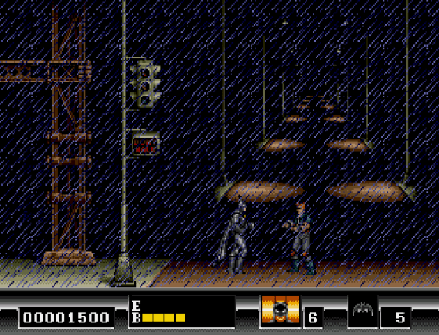 Genny Batman is an incredibly boring game. The combat is so flavorless, as you only punch and do a leg sweep type of kick. You can punch when you jump, but I never really found this useful and usually took damage when I attempted it. You only get one item in the platforming segments, the aforementioned non-returning batarang. While it completely trivialized a few of the boss fights (including the last one), it lacks the visual satisfaction that the NES game accomplished with a lot less horsepower. I also found the “block” move where Batman puts up his dukes to be generally ineffective. Without decent fisticuffs, Batman absolutely needed quality platforming gameplay to carry the day. Unfortunately, the platforming is even worse than the brawling. I’ll start with one of the worst double jumps I’ve ever seen. Early in the second level, I found myself unable to get past a stack of crates (“CRATES! MY ONLY WEAKNESS!”) until I dug up the instruction book via Sega Retro. That’s when I learned that if you quickly press the jump button a second time, Batman does this flippy move that’s more about helping to cover horizontal distance instead of jumping higher. Allegedly some enemies can be damaged by pouncing on them, but it feels like it was a coin flip on whether I’d damage them or they’d damage me.