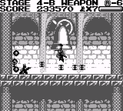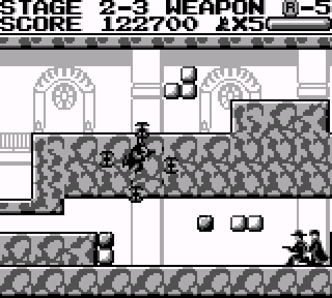 Batman shares even more DNA with Mario Land, as like Mario Land, it has two shmup levels that feel like they belong to a completely different game. Unlike Mario Land, the two stages where you pilot the Batwing are played back-to-back. They’re the game’s entire world 3. Also unlike Super Mario Land is the fact that I actually liked Batman’s auto-scrolling shmup levels. Like most of Game Boy Batman’s stages, they’re both too easy. The closest this build comes to putting up a challenge is the final level. Batman ends on an auto-scrolling platforming stage that often forces you to sacrifice your shields since its platforms are usually small, usually have an enemy on them, and usually leave you with little time to stop and aim your jump. And that’s fine, because the last level should put players to those kinds of risk/reward decisions. Batman’s two standard bosses are kind of boring, but otherwise, I’m surprised. I’d already played this before and remembered it being just okay. It’s a little better than that. In many ways, I liked this more than the NES game. It’s still pretty generic, but it also packs a lot of fun into very little game. I didn’t expect the Game Boy Batman to be one of the highlights of this feature. Sunsoft’s best decision was creating a new game that played to the Game Boy’s strengths instead of trying to copy a technologically superior game to a less capable platform.