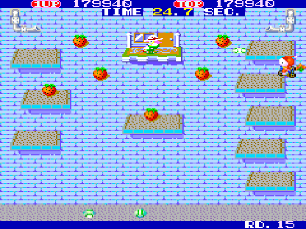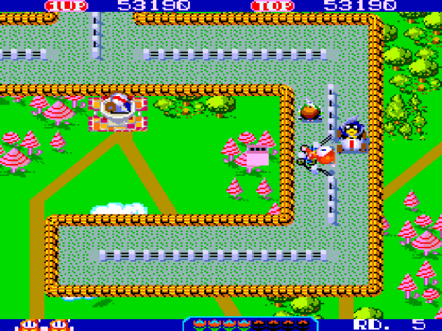 Spatter’s object is to grab all eight bouquets of flowers in each stage. As you do this, you’re pursued by chasers in go karts. You can’t jump just anywhere. There has to be a guardrail and not a solid wall. But, if there is a guardrail, Spatter’s incredible twist reveals itself: the jumping move is into the guardrail itself, causing it to bend in a cartoonish fashion. It works both offensively and defensively, and what’s truly bonkers is that it’s equally satisfying both ways. This is especially true if you dodge someone as you’re turning a corner, as it almost feels like cheating at a game of chicken. Hell, if you time it right while taking a corner, the rail will snap back like a rubber band and kill the guy in the oncoming lane. The enemies don’t exactly have the complex algorithms of Pac-Man ghosts. The karts chase you directly, but this is the rare maze chase that built around that, giving you means to dodge AND the instant gratification of bashing them off the road. It really is just as simple as doing a jump when they’re on the opposite side of you, and it has more OOMPH than most karate games from this era do.