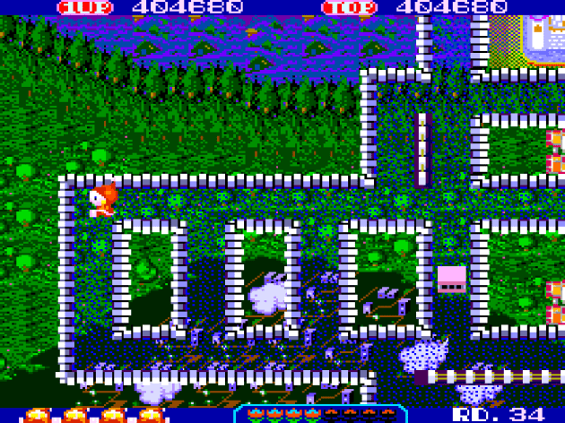 Mind you, the enemies respawn almost instantly. It’s a maze chase at the end of the day, and not every enemy can be defeated by the rail. A little green bomb robot and a bulldozer eventually enter the maze. The bulldozers are indestructible, but the bombs can be taken out by shoving boxes into them. Oh yea, there’s boxes, which contain bonus items that score you points. There’s a lot of bonus point opportunities, including tons of boxes on the playfield, points for quick completions, points for enemy knockout combos with the boxes, paper airplanes that fly in from outside the maze, and bonus rounds where Spatter temporarily becomes a 2D platformer where you have to avoid drops of water and climb up a series of ledges while collecting fruit. These were the weak links in the game and are so out of place that I wonder if this was originally the concept and they pivoted when they realized it wasn’t very fun. Or challenging, for that matter. I never once failed it. As you get deeper into the game’s 40 levels (which the level count includes the bonus stages), the stages still present plenty of bashing opportunities. I figured they’d up the challenge by eliminating them altogether. Instead, they space them out, but that only serves to increase the enjoyment. Seriously, why does nobody talk about this one?