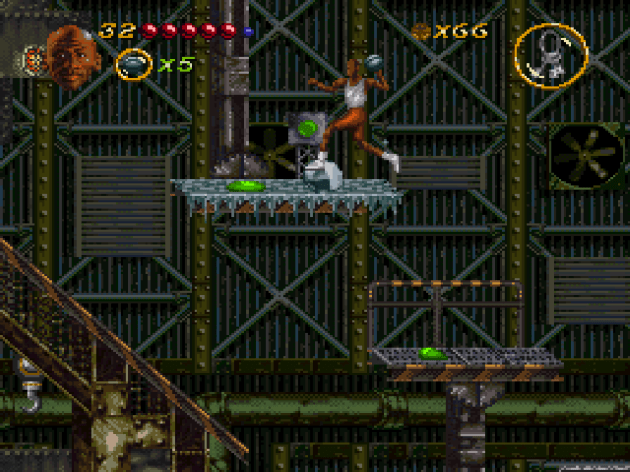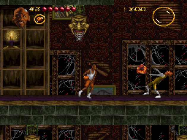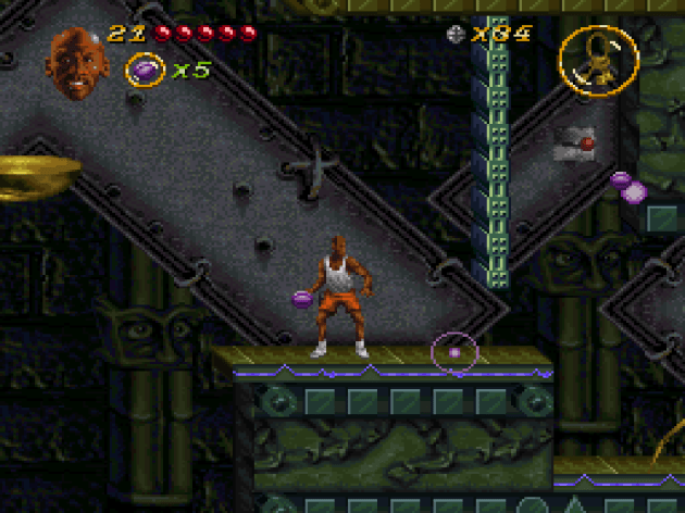 The last boss is a gigantic robotic Michael Jordan who had the courtesy to wear a generic, cheap-looking white tank top with orange shorts instead of a #23 Bulls uniform. Hey, he may be an evil mad scientist who’s trying to.. uh.. do something evil, no doubt. BUT, he’s not about to pay a sports team rights fee for a platform game.