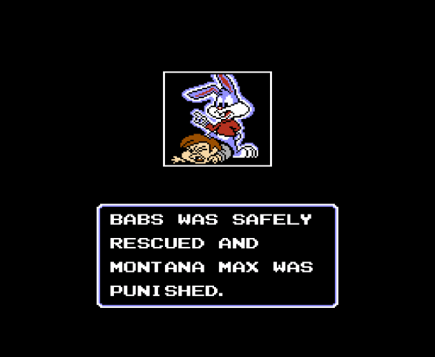I can’t speak for Babs Bunny, but I sure am bored. It’s telling that the game’s structure abruptly abandons the three levels to a world format after the fourth world. They were completely out of ideas. Now, it’s not like Konami put the varsity team on Tiny Toons. This game’s director only has four credits to his name at MobyGames. That’s only two more credits than *I* have. So, maybe this wasn’t phoned-in. Maybe a mediocre-at-best Mario knock-off was the absolute maximum they could squeeze out of their talent. I think it probably speaks more to the popularity of the source material that Tiny Toons is remembered as one of the best post-SNES 8-bit games. I’m going to guess children of the NES era probably wanted to like this a lot more than they did. It rarely comes up in casual conversation and only pops up in specific discussions of Konami or licensed games or even the best graphics on the NES. I don’t happen to think the graphics are that good. The sprites are, sure. But the worlds they inhabit don’t feel alive. That’s 50% of the equation, because the settings and facades of the levels have to be immersive. I don’t think Tiny Toons comes close. These levels feel dead inside, like I do after playing this. I know this probably wasn’t the review fans wanted, but I didn’t want bricks thrown through my windows on my birthday either. Sigh. I knew I should have reviewed the G.I. Joe NES games instead. Nobody throws bricks over those.