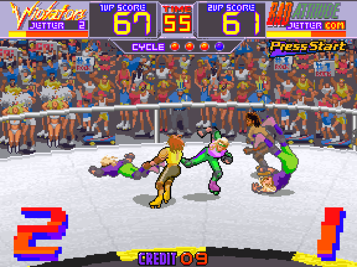 I’m the one in yellow. When you swing an opponent by their feet, it instantly takes out all other enemies. It’s the quickest way to score points, though for the life of me I couldn’t figure out how to do it consistently.