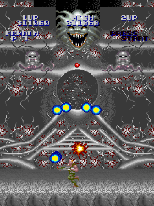 Okay, this IS kind of funny. See the two probes with the electricity running between them? They don’t kill you, or damage you, or anything. They do nothing. You stand right over them. Not even the energy hurts you. Cutting Room Floor, aka my favorite gaming site in the whole wide world, generously describes this as an “oversight.” Yes. Yes, “oversight.” I don’t think they just forgot to program that as a lethal element. It feels like an adjustment made by play testers, because I genuinely think if they hadn’t done this, Super Contra’s reputation would have gone from “meh” to outright scathing on account of extreme difficulty. There’s just not enough room to fight it without those being nerfed. Once again, the coin-op feels like it fails to make the best use of the vertical screen.